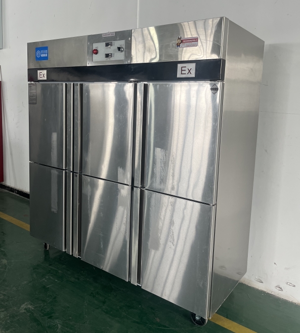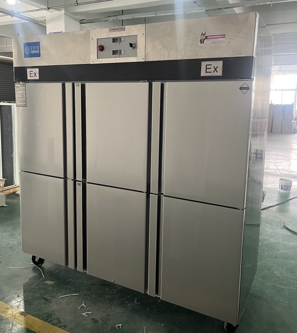 • 我公司生產的六門不銹鋼同騰防爆冰箱(以下簡稱防爆冰箱),產品防爆要求是根據GB3836.1-2010《爆炸性環境 第1部分:設備 通用要求》、GB3836.2-2010《爆炸性環境 第2部分:由隔爆外殼“d”保護的設備》、GB3836.4-2010《爆炸性環境 第4部分:由本質安全型“i”保護的設備》、GB3836.9-2006《爆炸性氣體環境用電氣設備 第9部分 澆封型“m”》及GB3836.15-2017《爆炸性氣體環境用電氣設備 第15部分:電氣裝置的設計、選型和安裝》的規定制成防爆結構,經國家授權的質量監督檢驗部門檢驗合格,其防爆標志為ExdbibmbⅡCT4 Gb。適用于工廠存在或可能存在ⅡA、ⅡB級、ⅡC,T1~T4組可燃性氣體、蒸氣與空氣混合形成的爆炸危險1區或2區場所。該產品經國家防爆電氣產品質量監督檢驗中心檢驗合格并取得了防爆合格證。空調機廣泛適用于石油、化工、冶金、制藥和國防工業等空氣中存在爆炸性氣體混合物的自封閉的室內之用。